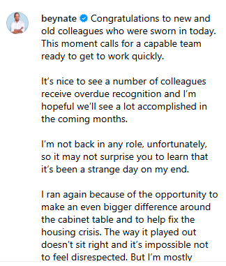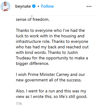The arrogance of “feeling disrepected.” You were re-elected. That should be enough. The arrogance of thinking you are owed a place in ministry. The subtle dig at Carney by thanking Trudeau in your post. This entitlement is exactly why people hate the Liberals. Let it be said, people’s memories are long, and don’t think that just because Carney almost got a majority people have forgotten the tendency of long-time politicians to treat governance like a social club where cabinet — sorry, ministry — appointments are shuffled about as rewards instead of portfolios of responsibility. Watch yourself, Nate Erskine-Smith. That goes for your Liberal colleagues too.