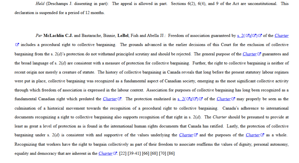 It was a challenge to the legislation that tore up the agreements of BC Health Care workers that led to that change to Charter interpretation, at least with respect to 2(d). The court clearly stated that freedom of association includes a right to bargain collectively.